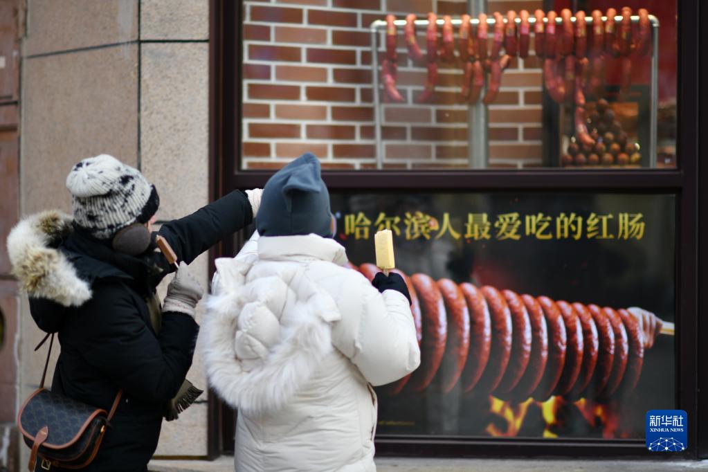1月22日,在哈尔滨中央大街,游客在一家哈尔滨红肠售卖店铺前留影。