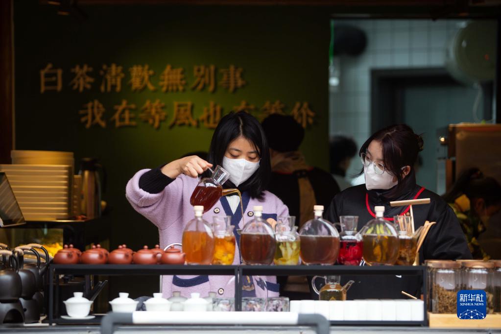 1月22日,在贵州省安顺市西秀区安顺古城历史文化街区,一家茶饮店铺工作人员在为顾客准备茶饮。