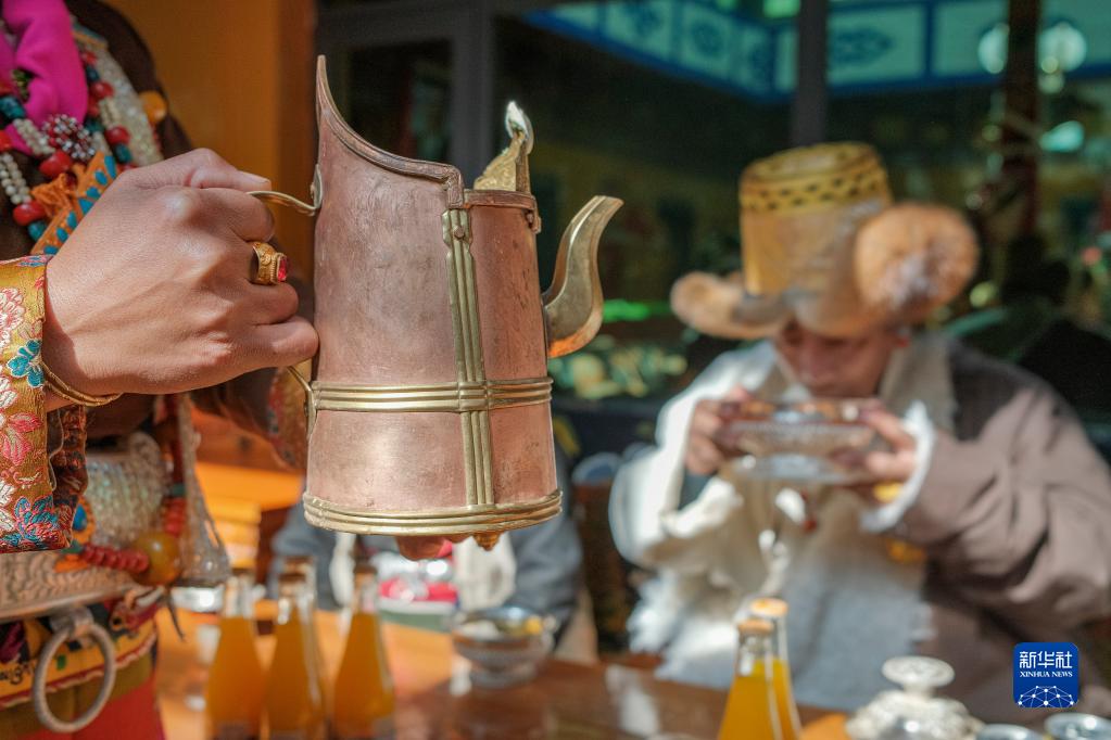 次旦老人的孙女给家人敬上青稞酒(1月22日摄)。