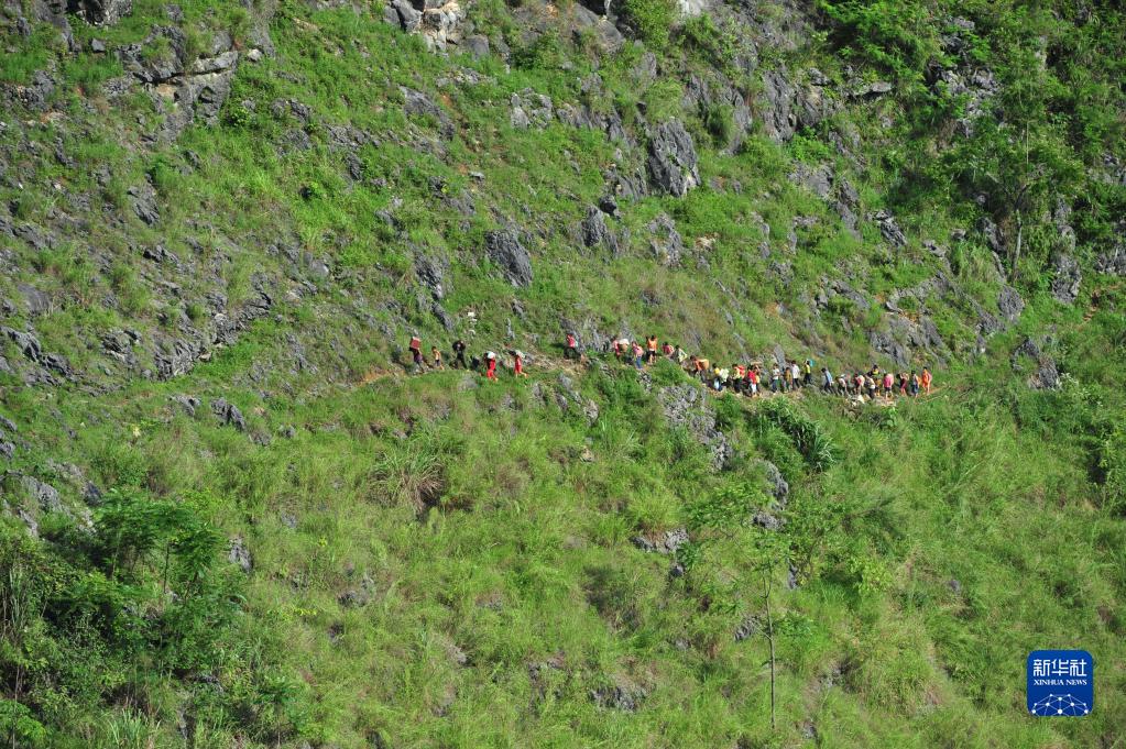 蒙宣任、蒙宣汰兄弟和同学结伴走在回家的山路上(2012年7月4日摄)。