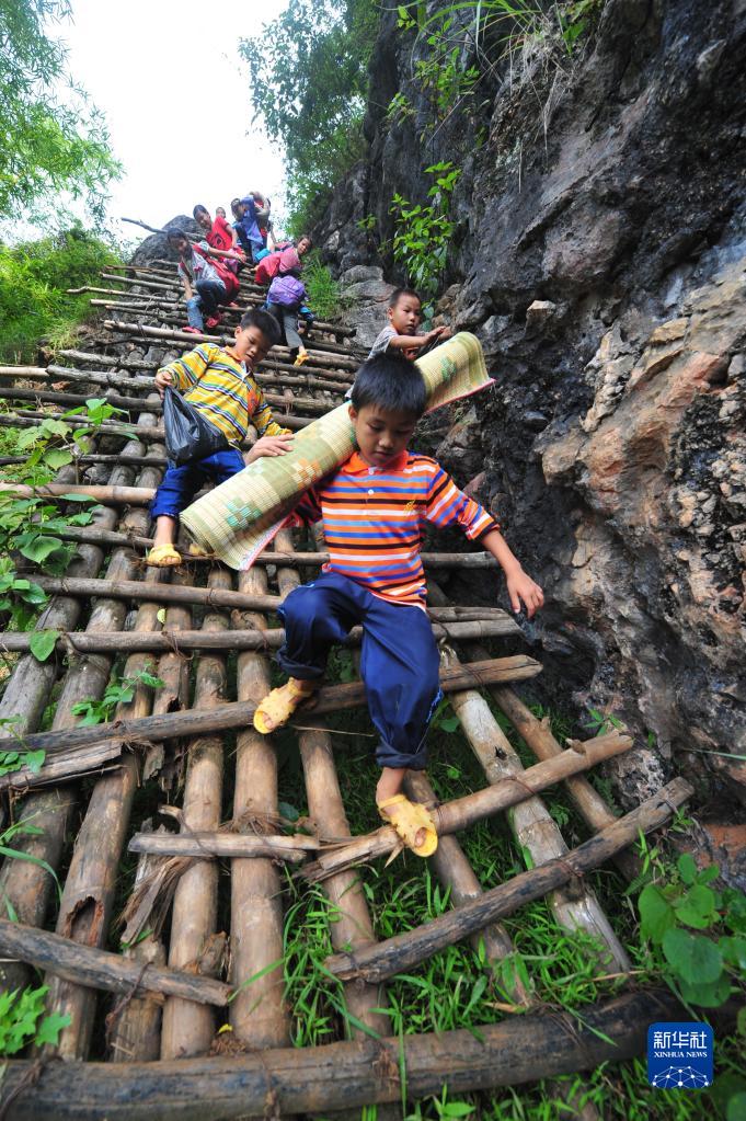 在大化瑶族自治县板升乡弄勇村弄顶屯,四年级学生蒙宣任背着生活用具,爬“天梯”去上学(2012年9月3日摄)。