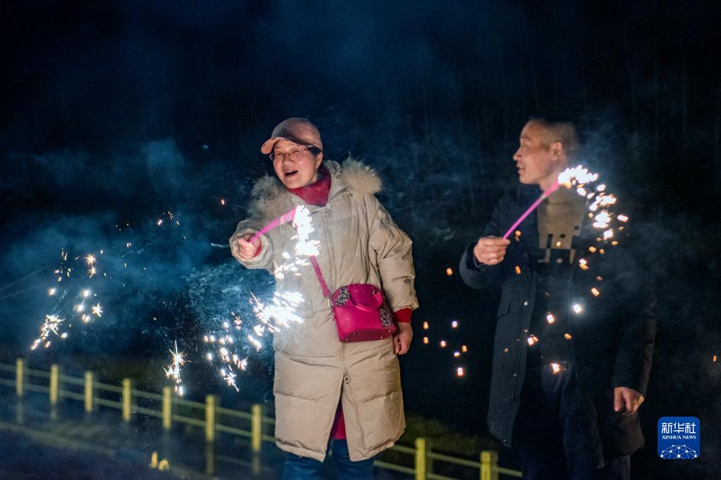 辞旧迎新之际,在允许燃放烟花爆竹的区域,人们点燃喜庆的烟花,迎接新春佳节。
