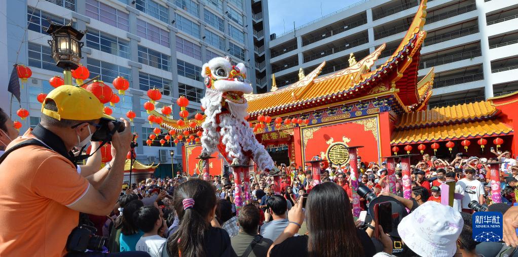 当日,文莱华人举行舞龙舞狮和“开门迎宾”活动,庆祝兔年新春佳节。