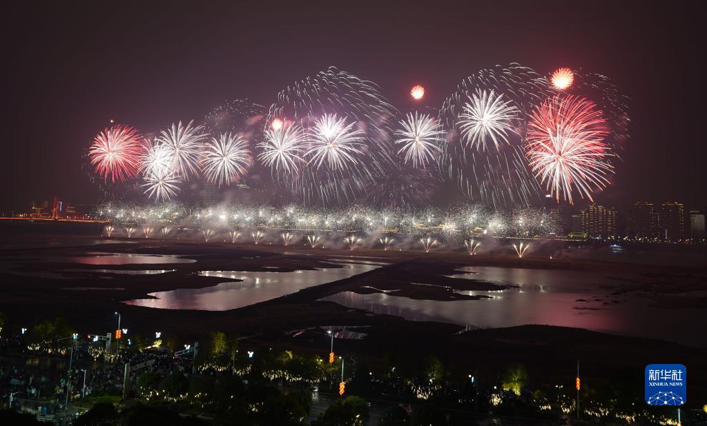 1月22日大年初一晚,2023年南昌市迎春烟花晚会在江西省南昌市赣江老官洲上演。绚烂缤纷的烟花在夜空中争奇斗艳,为市民及游客送上新春祝福。