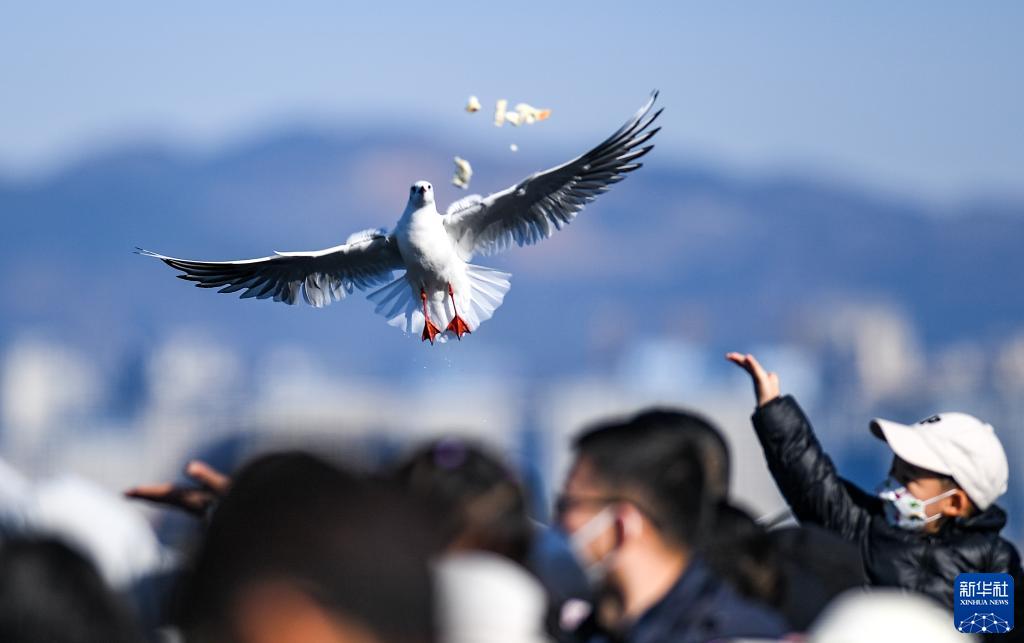 1月23日,游客在昆明市滇池海埂大坝上投喂红嘴鸥。
