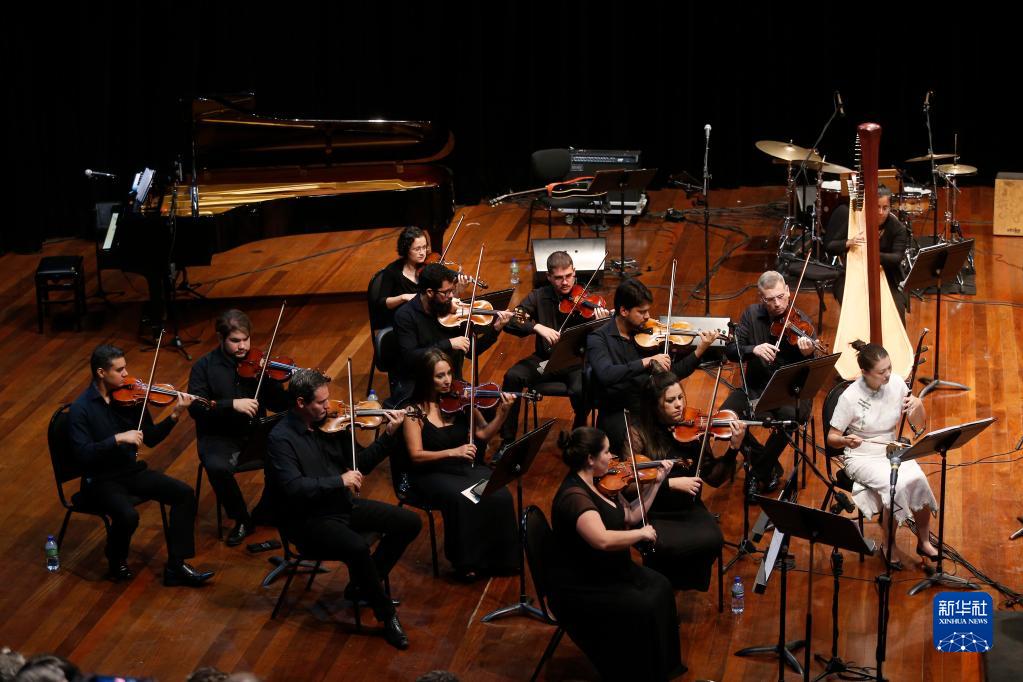 1月21日晚,在巴西首都巴西利亚普利尼奥·马科斯剧院,中国民乐演奏家与巴西利亚室内乐团的音乐家们在2023年“欢乐春节”音乐会上演奏乐曲。