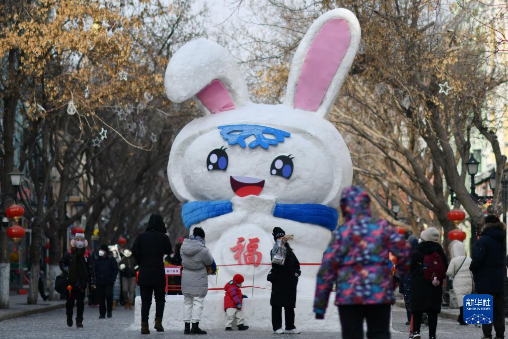 在哈尔滨中央大街,游客和兔子雪雕合影(1月22日摄)。