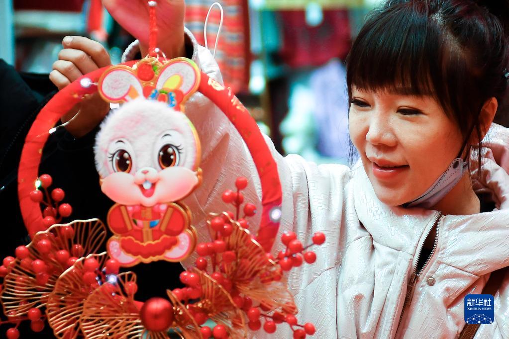 在吉林省长春市中东大市场年货大集,市民选购兔子元素春节饰品(1月19日摄)。