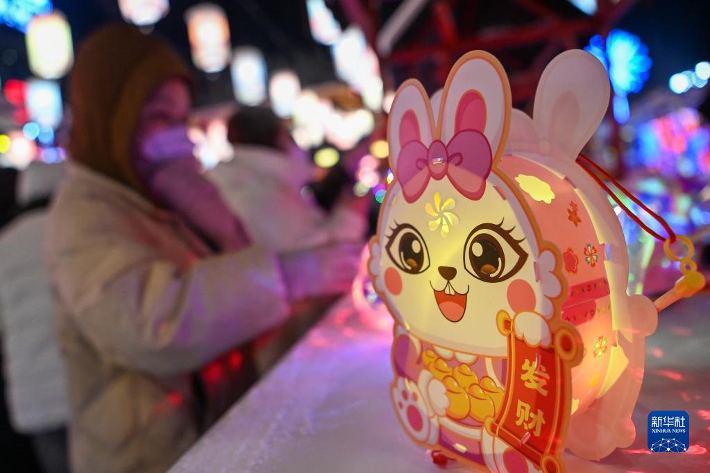在乌鲁木齐市水磨沟区七一东街广场,市民选购兔子造型花灯(1月22日摄)。