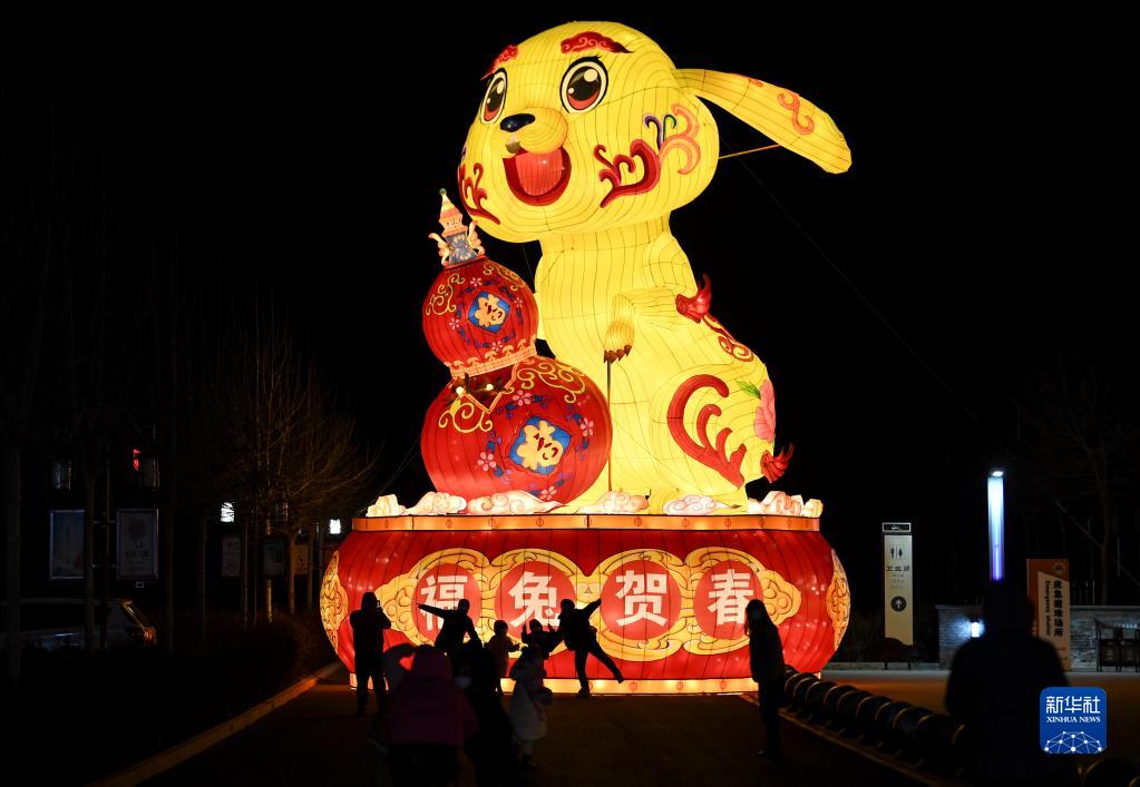 人们在宁夏吴忠市盐池县九曲民俗文化园观赏兔子造型花灯(1月22日摄)。