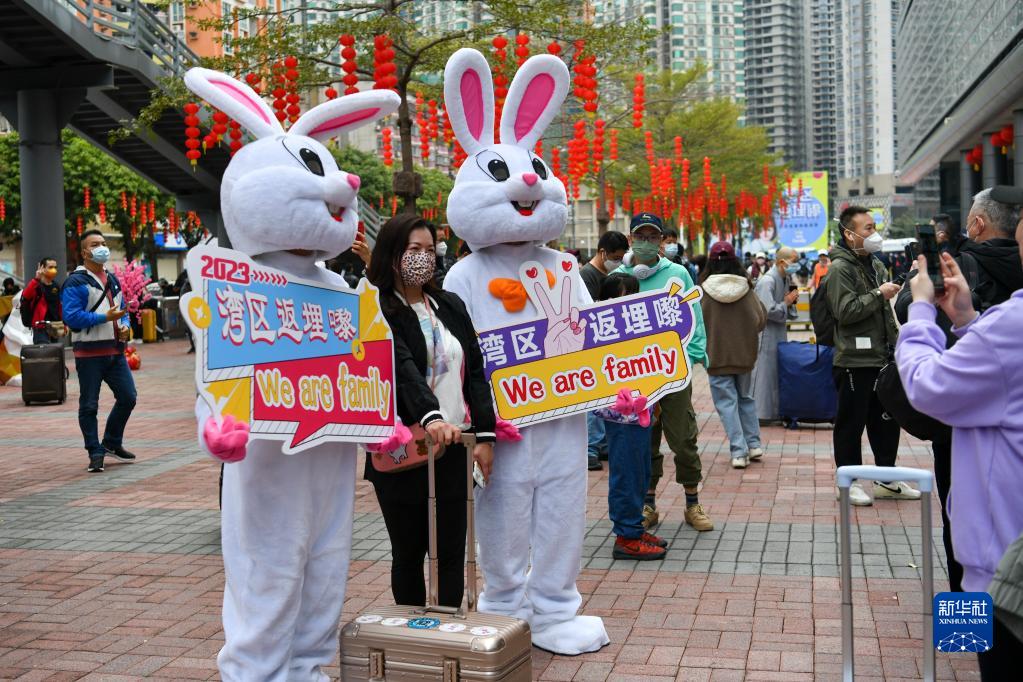 在深圳福田口岸外,两只兔子人偶欢迎从香港返深的人们(1月8日摄)。