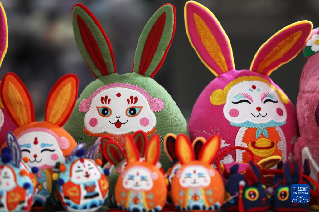 山东省临沂市郯城县郯国古城景区一家商铺的国潮五福兔摆件和挂件(1月23日摄)。