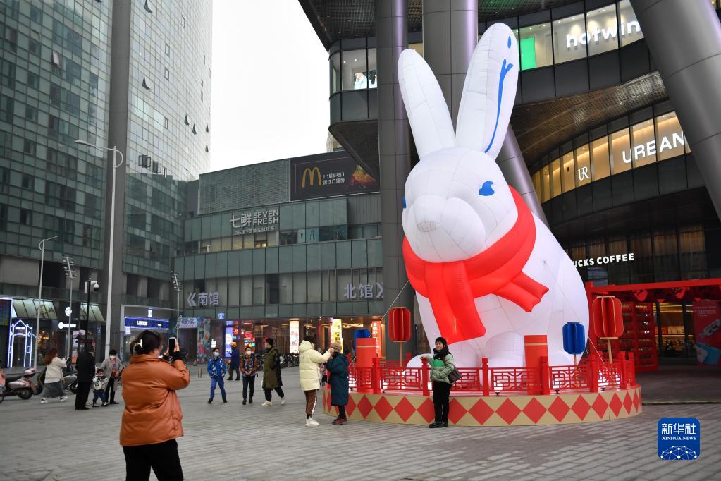 市民在长沙市北辰三角洲大悦城和巨型充气兔合影(1月23日摄)。