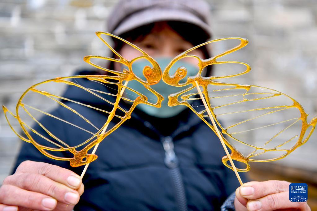 在安徽省亳州市花戏楼景区,民间艺人在展示制作的糖画生肖兔(1月23日摄)。
