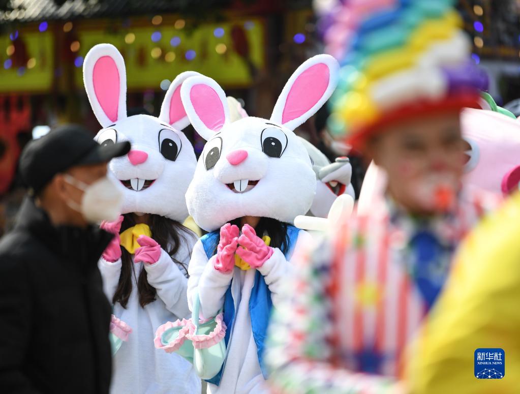 1月23日,在2023成都金沙太阳节活动现场,装扮成兔子造型的人偶和游客互动。