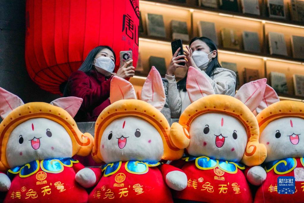 1月22日,游客在河北省唐山市唐山宴美食街生肖兔摆件旁拍照。