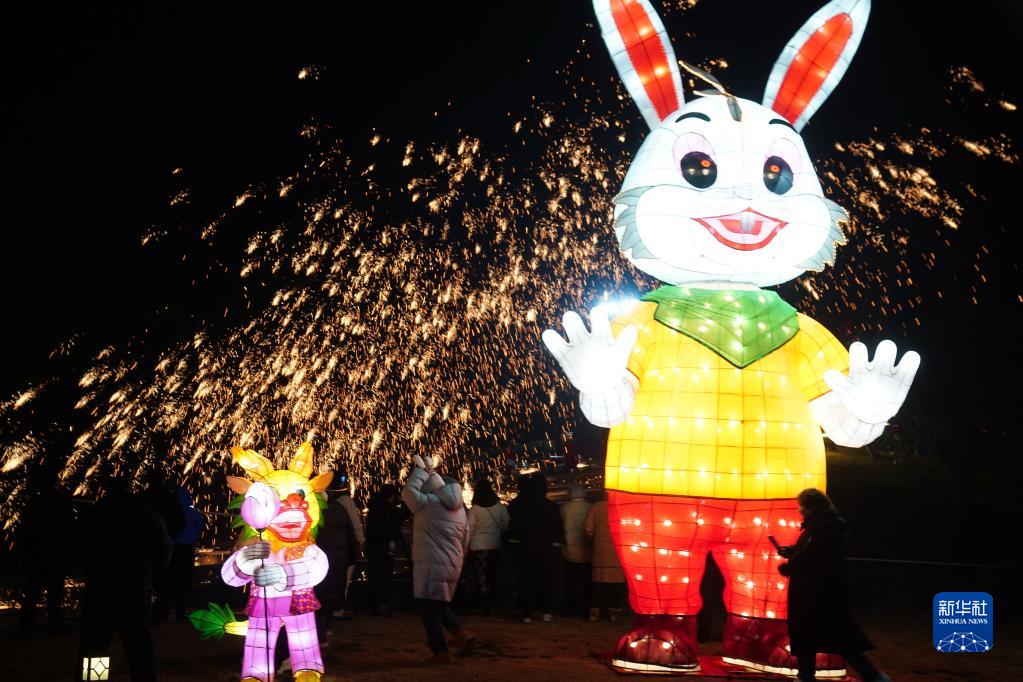 1月23日,在江苏省淮安市盱眙县第一山历史文化街区崖壁广场大型兔灯旁,游人观看打铁花表演。