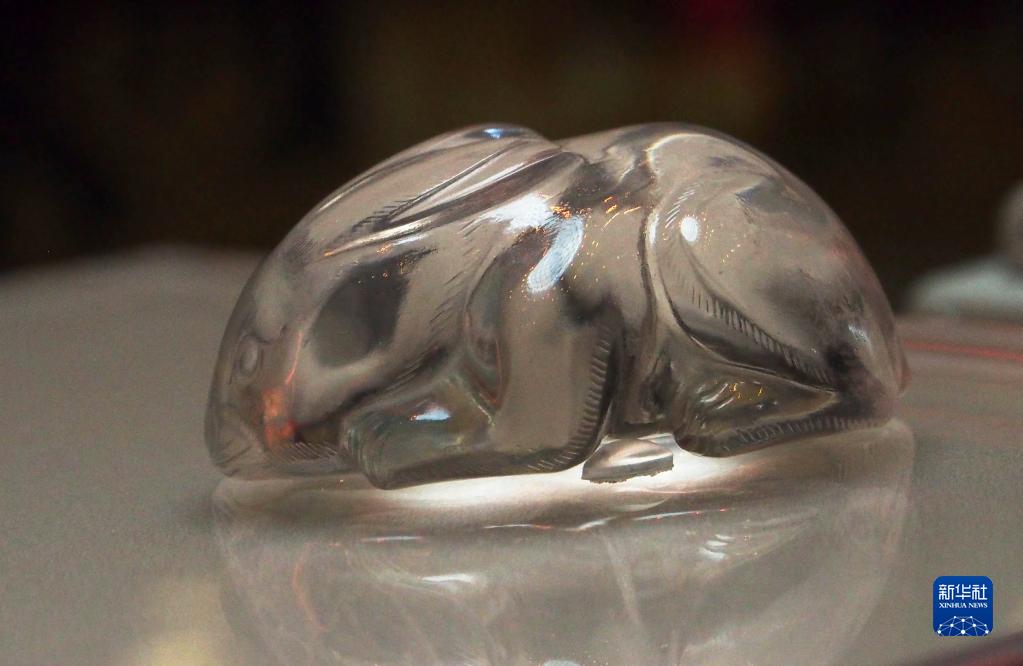 在上海博物馆拍摄的元代水晶兔(1月22日摄)。元代水晶兔于1994年在上海市松江区圆应塔地宫出土。兔双眼为圆圈状,眼梢线向左右延伸,抿嘴,鼻子、胡须和四爪均用阴刻粗线条勾勒,兔毛以平行的细短阴线刻饰,装饰性强。腹背竖穿一孔,可系可佩。整体似作觅食状,质朴敦实、憨态可掬。