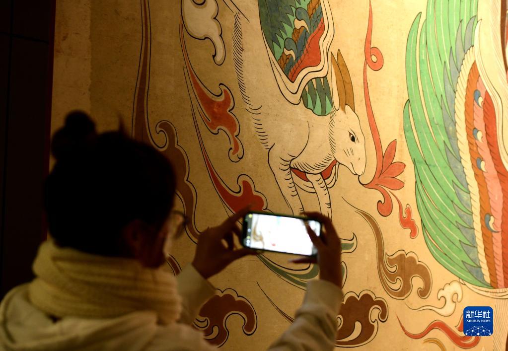 市民在河北博物院壁画展厅拍摄壁画中的羽兔(1月23日摄)。