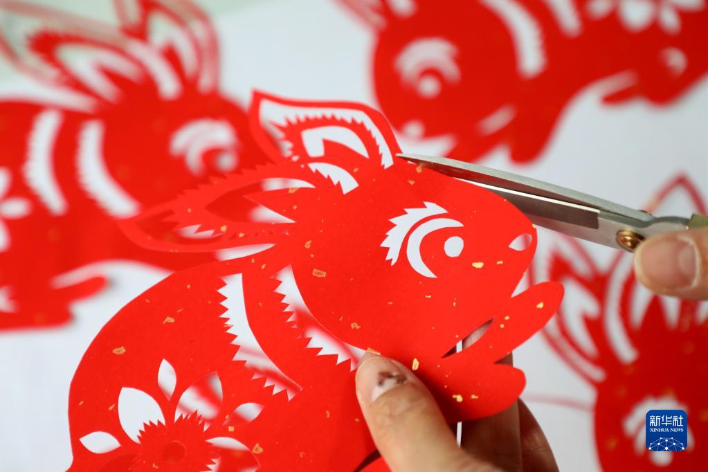 山东省滨州市惠民县李庄镇民间艺人在创作生肖兔剪纸作品(1月13日摄)。