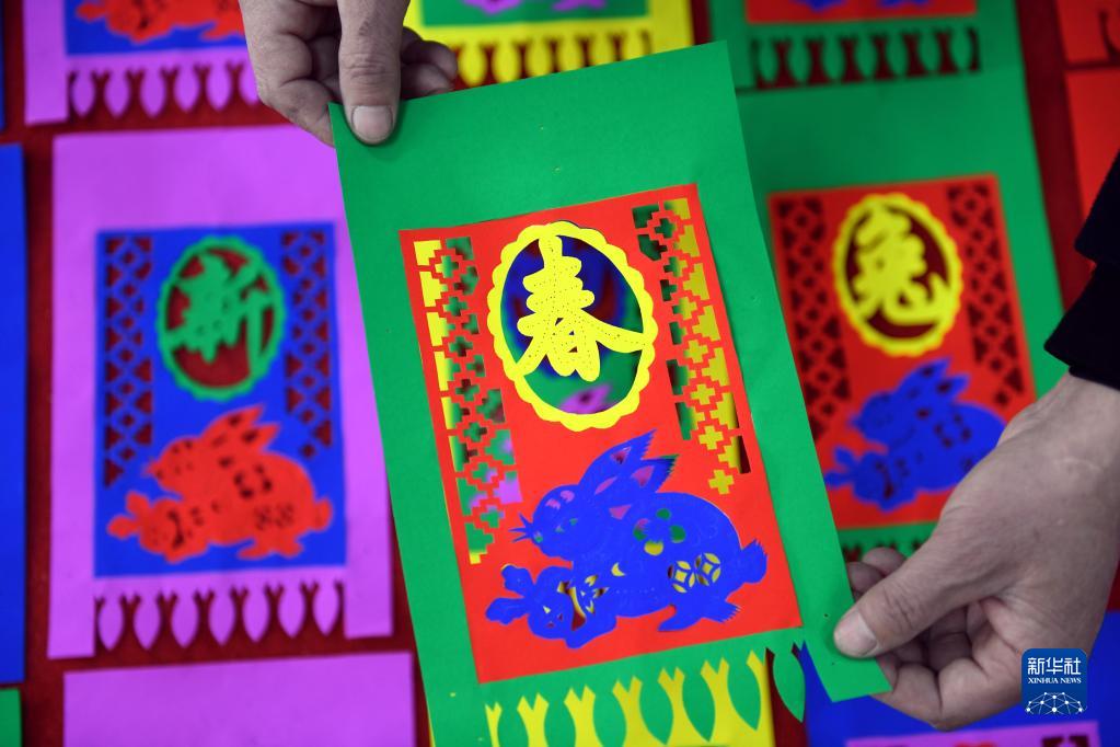 山东省临沂市郯城县马头镇民间艺人张乃苍展示制作的挂门笺“玉兔迎新春”(1月15日摄)。