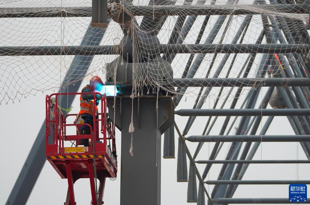 1月23日,在重庆两江新区新能源汽车产业园基础设施配套项目现场,工人在进行钢结构网架拼装后的焊接作业。