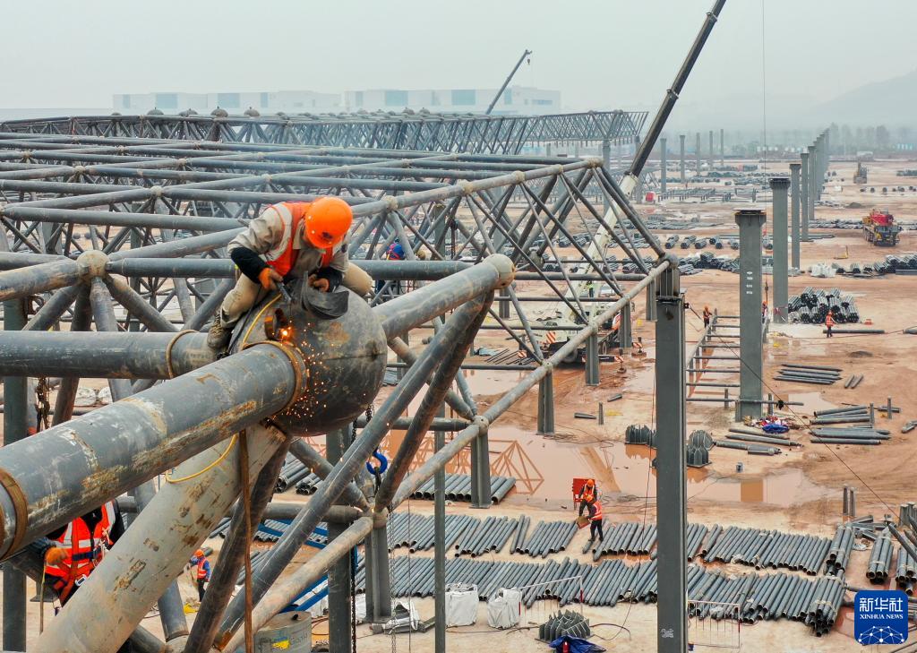 1月23日,在重庆两江新区新能源汽车产业园基础设施配套项目现场,工人在进行钢结构施工作业(无人机照片)。
