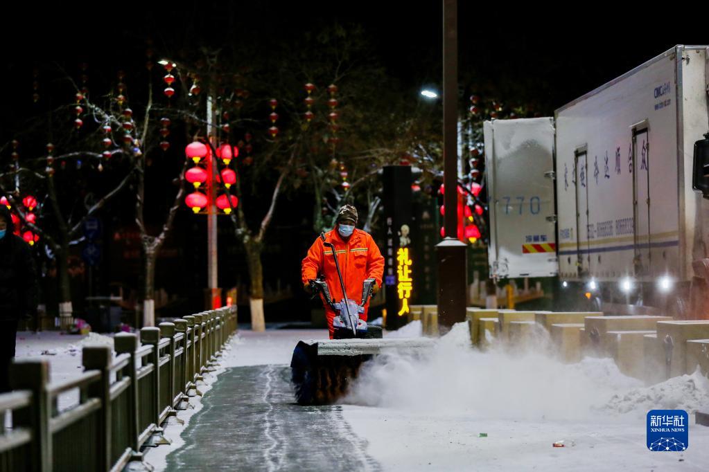 1月23日,在甘肃省酒泉市东方广场,环卫工人用除雪车清理路面上的积雪。