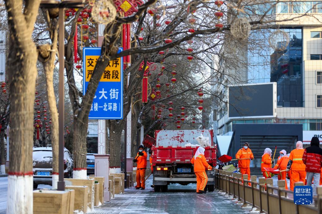1月23日,在甘肃省酒泉市北大街,环卫工人在清理路面上的积雪。