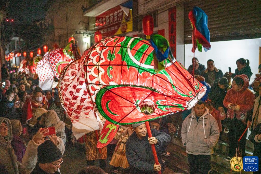 1月23日晚,在安徽歙县北岸镇瞻淇古村落,人们嬉鱼灯庆新春,引来摄影爱好者和游人观看。
