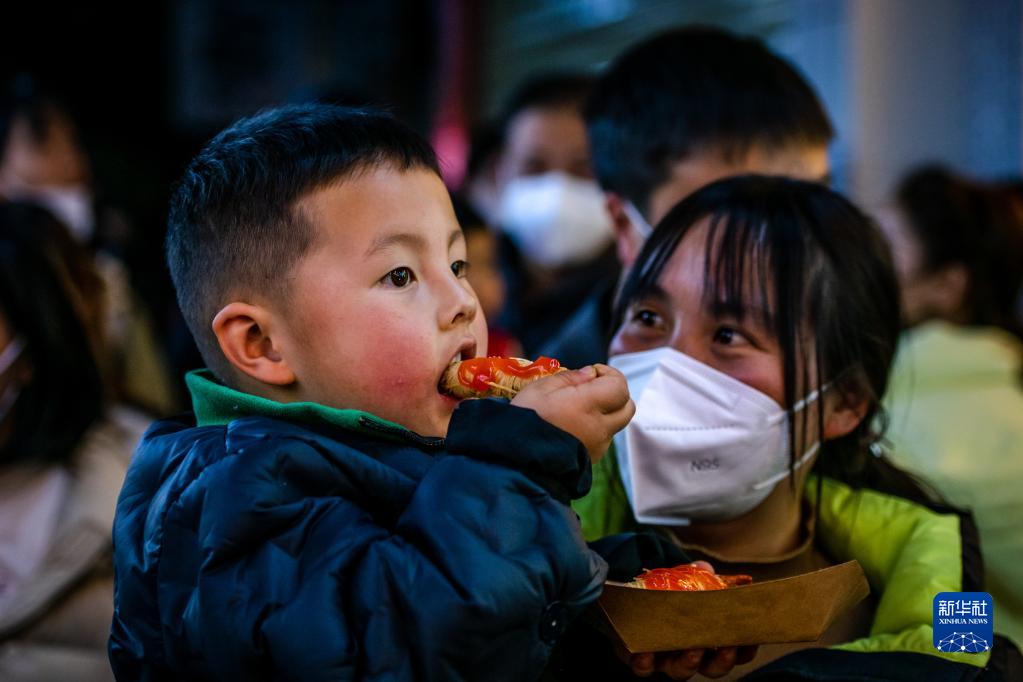 1月23日,在云南省昆明市南屏街,一个小孩子在品尝特色小吃。