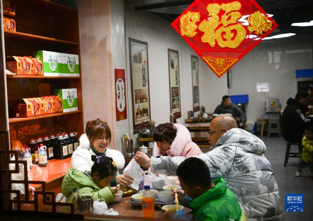 1月24日,在位于陕西省咸阳市的福园巷子街区,游客在一家商铺品尝臊子面。