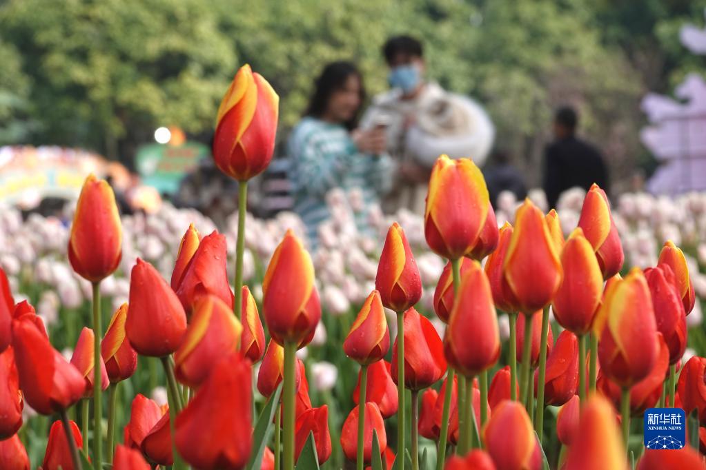 1月24日,游人在广西南宁青秀山风景区观赏郁金香。