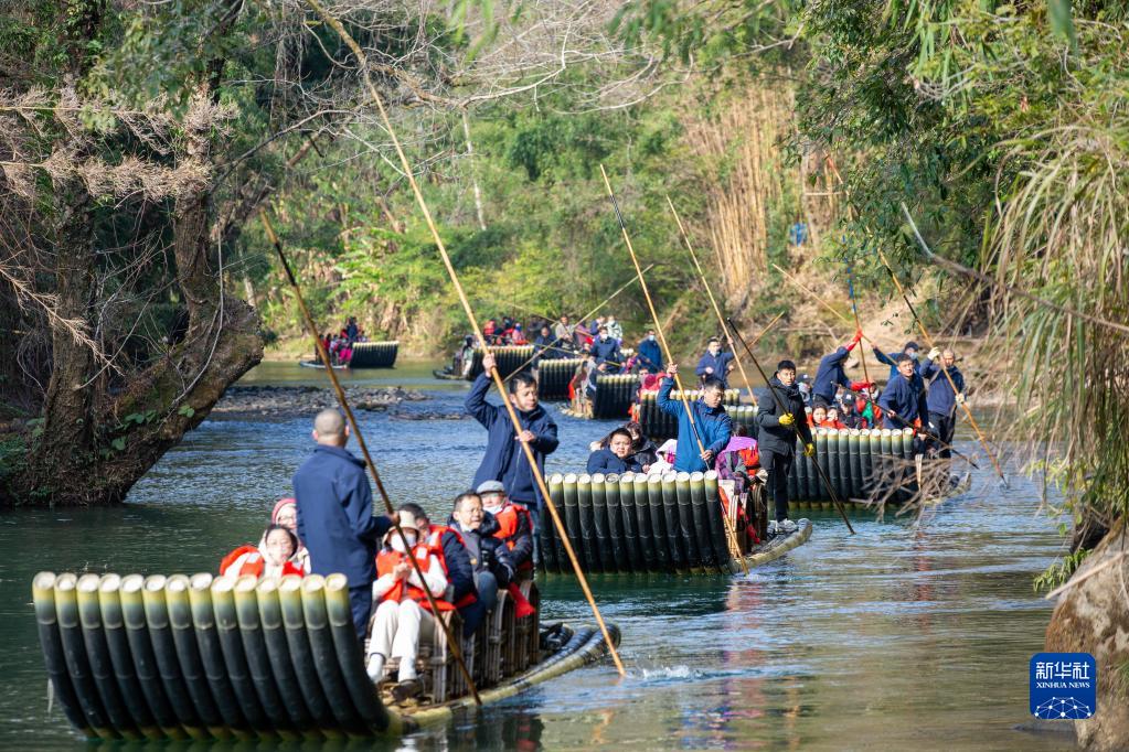 1月24日,游客在福建武夷山景区乘竹筏游览九曲溪。
