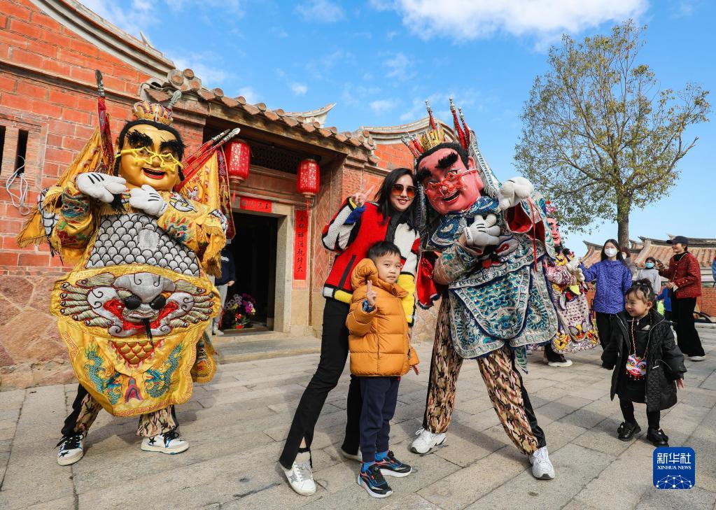 1月24日,在福建晋江梧林传统村落,游客与“电音三太子”演员合影。