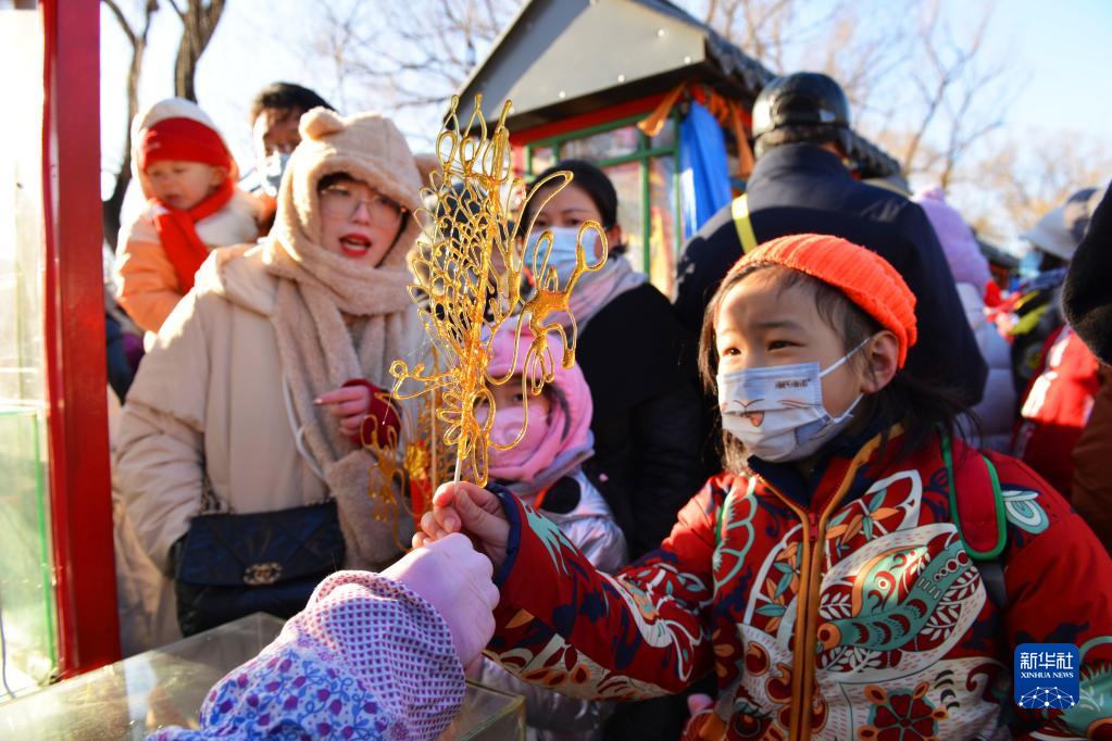 1月24日,小朋友在2023年圆明园新春游园会上购买糖画。