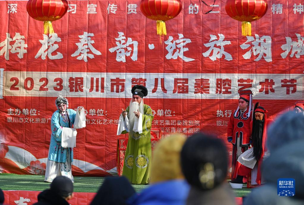 1月25日,演员在宁夏银川市贺兰县润园文化广场为戏迷表演秦腔剧目《烙碗记》。