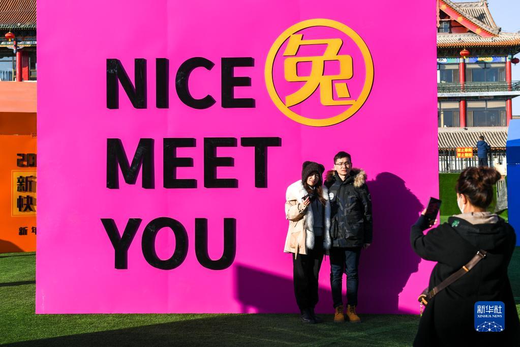 1月25日,市民在内蒙古呼和浩特市玉泉区大召广场与新春展板合影。