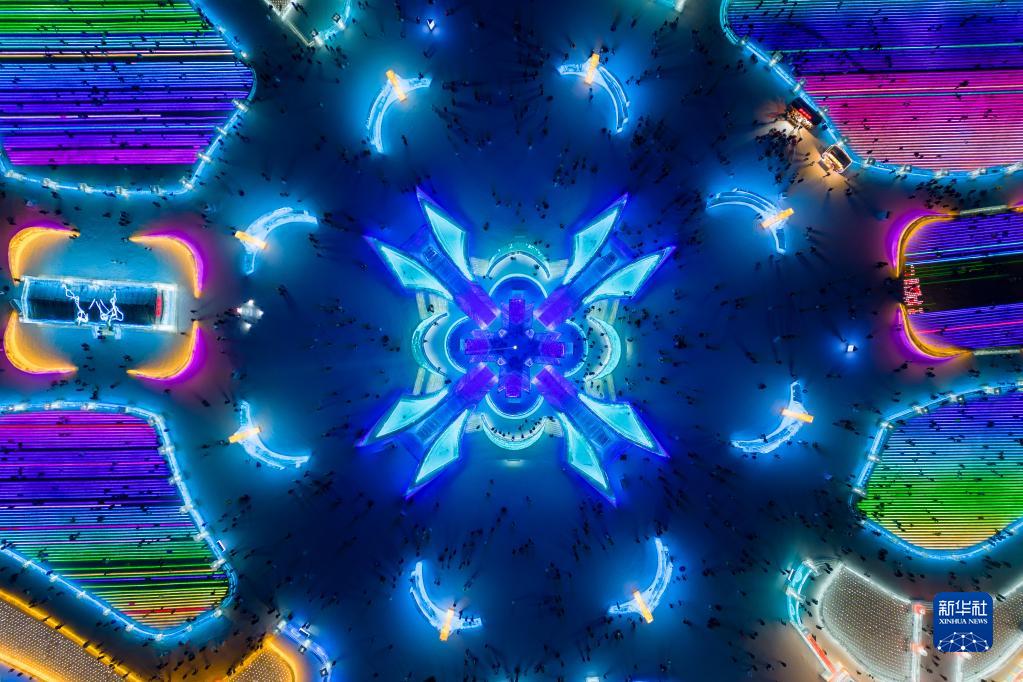 这是1月25日拍摄的哈尔滨冰雪大世界园区夜景(无人机照片)。