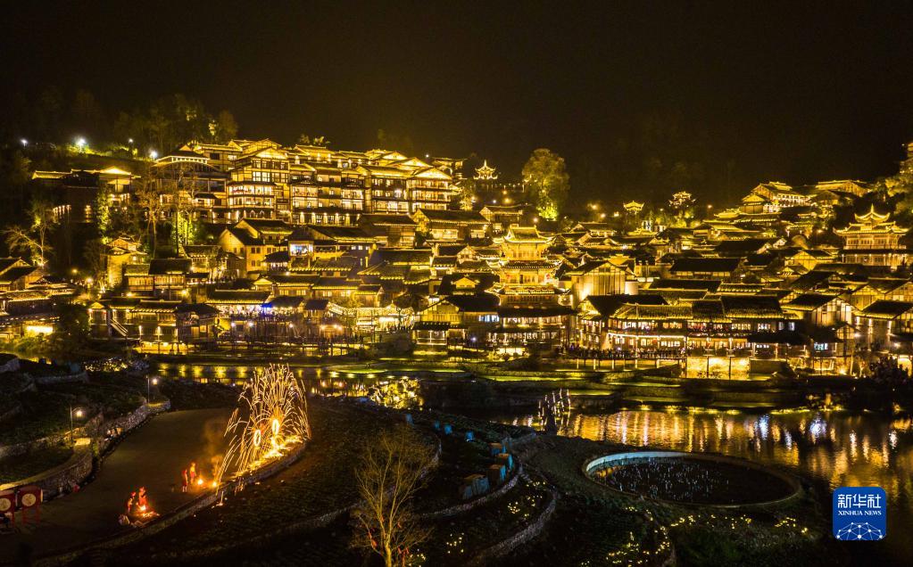 1月24日拍摄的贵州省遵义市乌江寨景区的打铁花表演(无人机照片)。