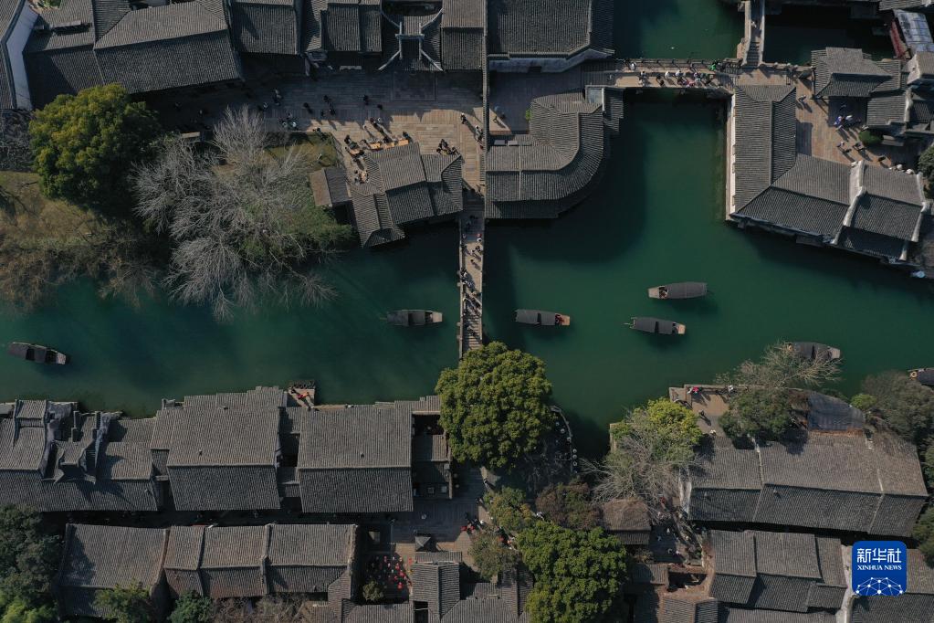 1月26日,游客在浙江省桐乡市乌镇景区游览(无人机照片)。