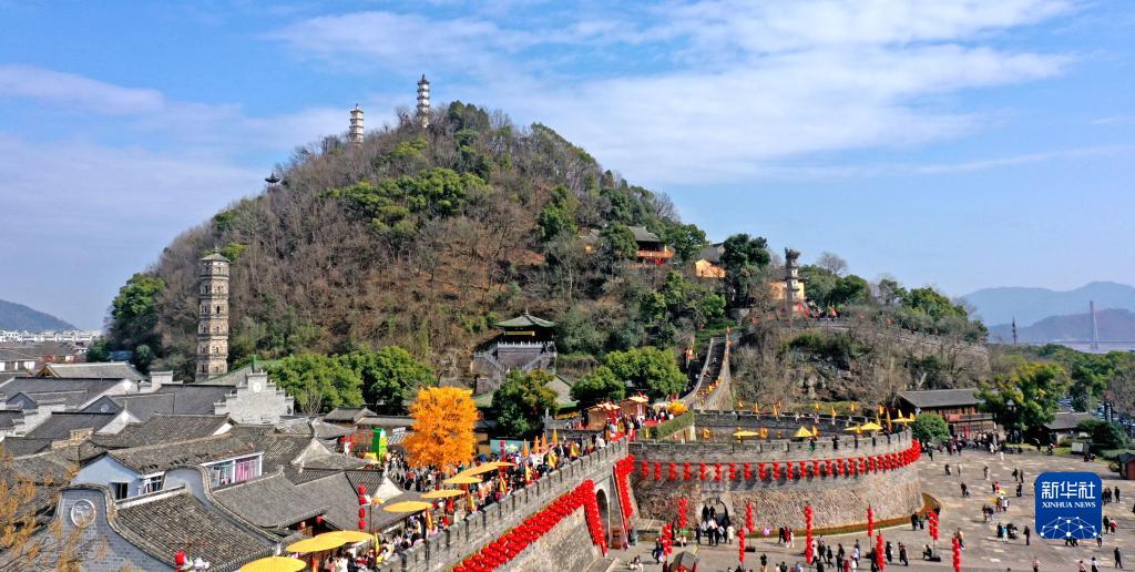 1月22日,游客在浙江省台州市临海市紫阳古街游玩(无人机照片)。
