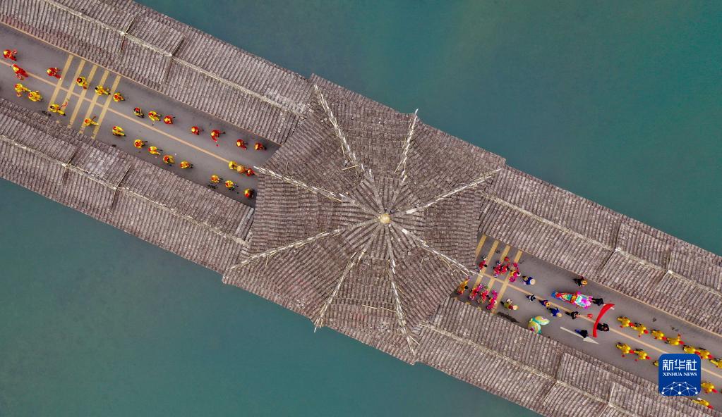 1月26日,民间艺人在贵州省铜仁市玉屏侗族自治县风雨桥上进行民俗展演(无人机照片)。