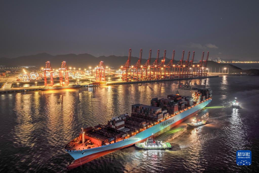 这是1月25日晚拍摄的宁波舟山港金塘港区大浦口集装箱码头(无人机照片)。