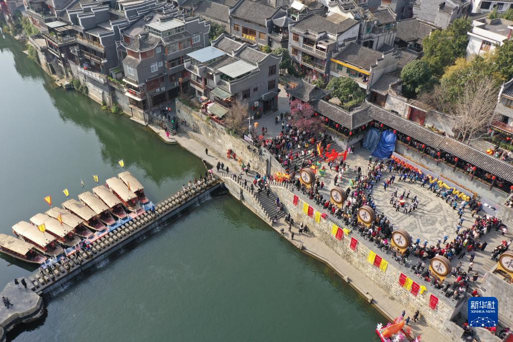 1月24日,在湖南省湘西土家族苗族自治州吉首市乾州古城,民间艺人在进行游春表演(无人机照片)。