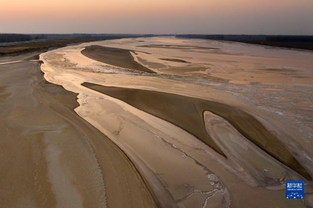 1月25日,落日余晖中,黄河山东高青段流凌与河汊交织,姿态万千(无人机照片)。