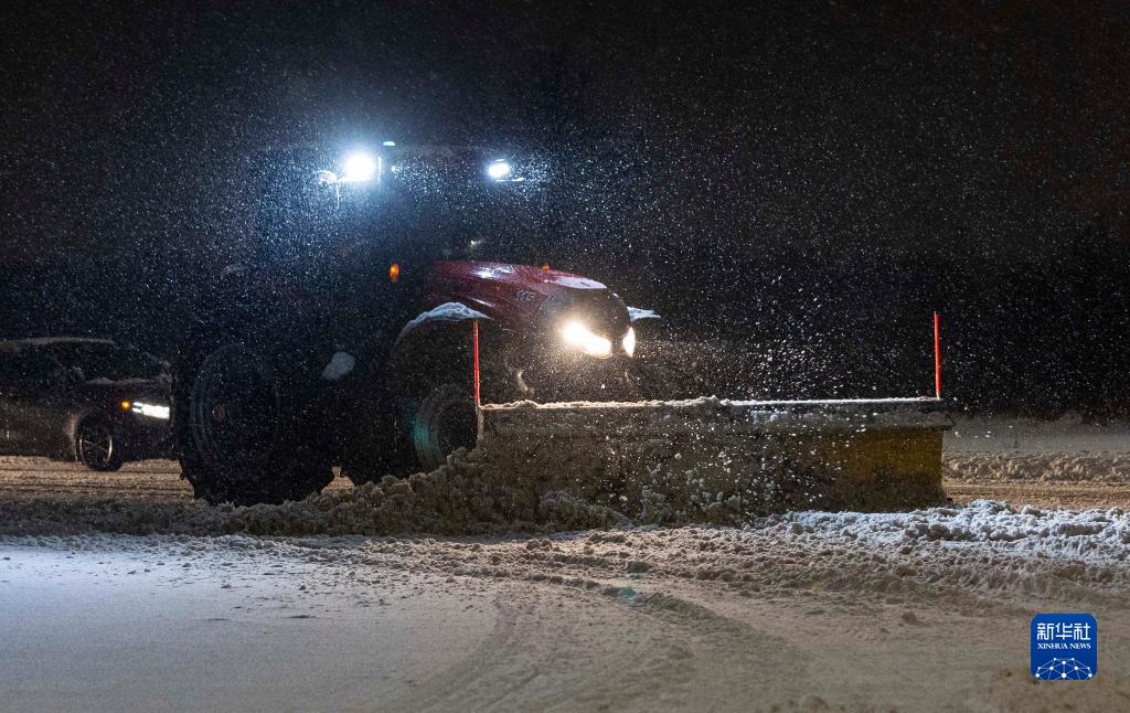 1月25日,在加拿大大多伦多地区米西索加,铲雪车清理道路积雪。
