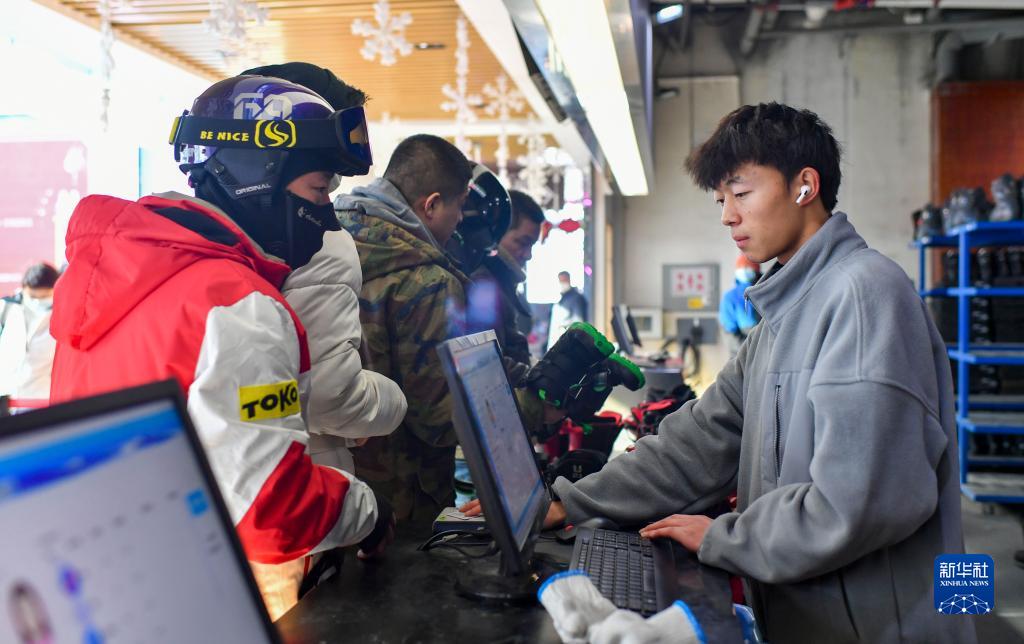 雷嘉俊(右)在新疆丝绸之路国际度假区雪具大厅为游客登记雪具租赁信息(1月25日摄)。