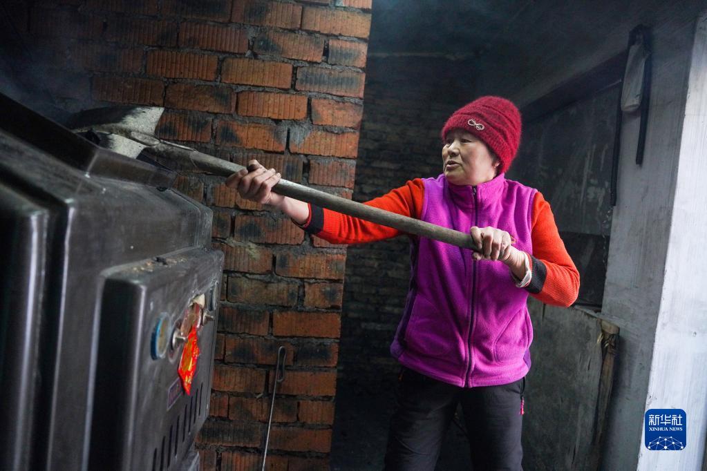张红霞给民宿里的火炕加热(1月21日摄)。