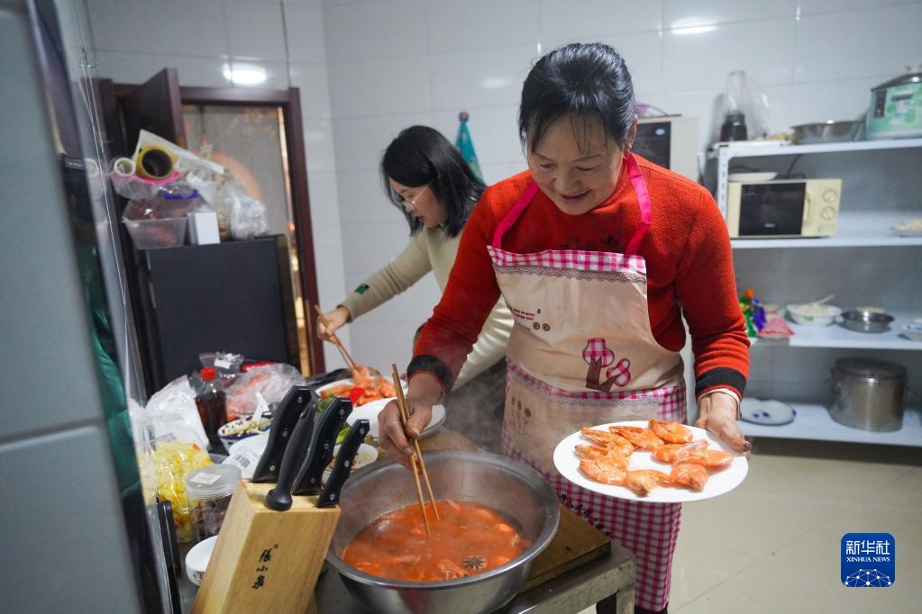 张红霞(右)在家中的厨房里为雪友准备年夜饭(1月21日摄)。